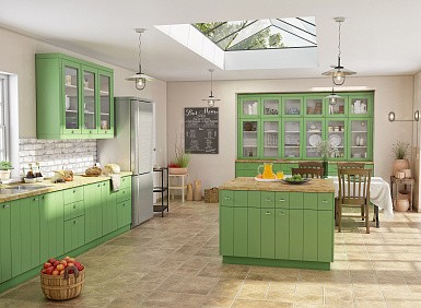 Выбирая оттенок для просторной кухни, учитывайте ее местоположение. Для комнаты на северной стороне подойдут ярко-желтые, оранжевые, бежевые комплекты. Такая мебель сгладит недостаток естественного освещения. Для помещений, расположенных в южной части, дизайнеры рекомендуют зеленые, синие, фиолетовые модели. Подобные расцветки визуально охлаждают помещение.