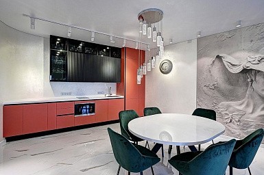 Если есть возможность, установите над столом для приема пищи навесные светильники. Благодаря этому приему обеденная зона будет смотреться особенно эффектно.