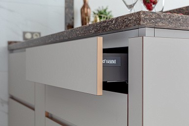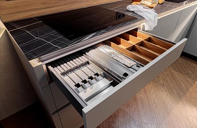 Все кухонные гарнитуры имеют рабочую поверхность, под которой устанавливают места хранения. Специалисты рекомендуют оборудовать нижние модули выдвижными полками, так как они вмещают большое количество предметов и более удобны в использовании. Традиционные ящики лучше оснастить разделителями, что обеспечит комфортное размещение предметов.