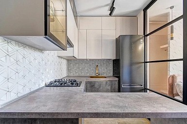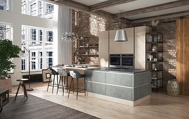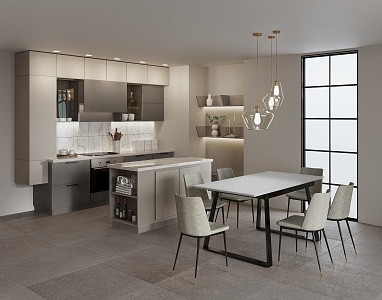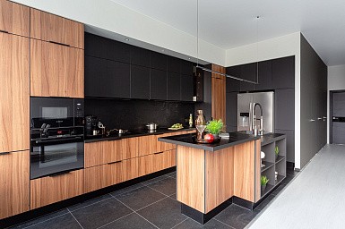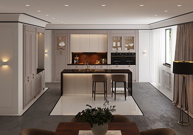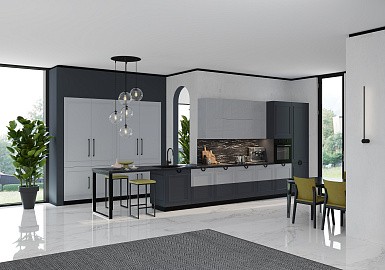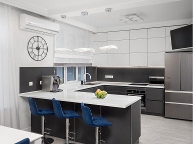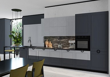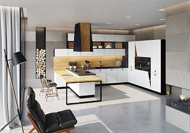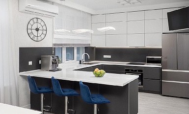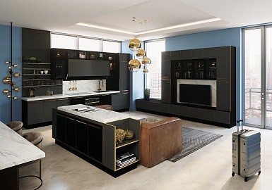 В больших помещениях кухня и гостиная часто оказываются совмещенными. Визуально отделить одну зону от другой можно с помощью островной конструкции, барной стойки или стеллажа. Зонирование с помощью кухни на заказ от производителя технически выполнить гораздо проще. Дело в том, что комплект будет изготовлен с учетом архитектуры пространства.