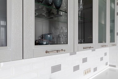 Высокие шкафы-пеналы обычно устанавливают по краям. В них можно спрятать некоторую бытовую технику, а на самые верхние полки убрать предметы, которые используются очень редко.