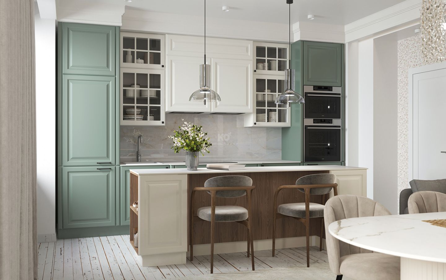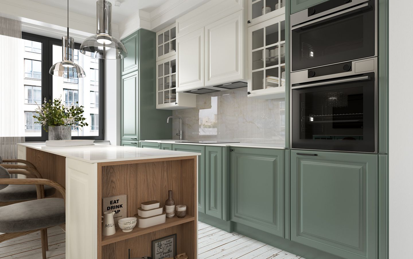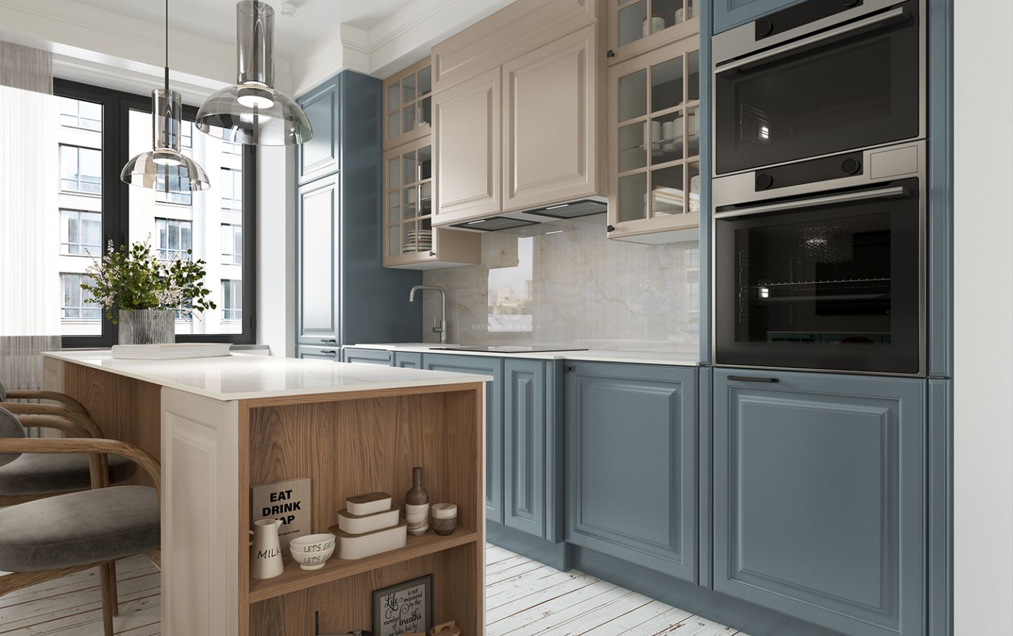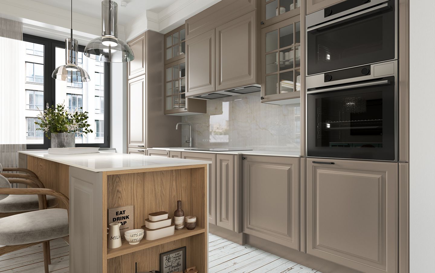 Шкафчики со вставками из стекла напоминают французские окна, характерные для домов исторического центра Парижа эпохи знаменитого градостроителя Османа. Эти прозрачные элементы придают кухне лёгкость, глубину и игру света, создавая ощущение утреннего парижского бульвара, залитого мягким солнечным светом.