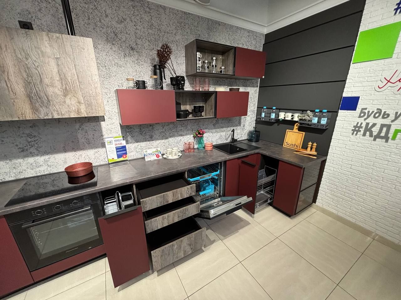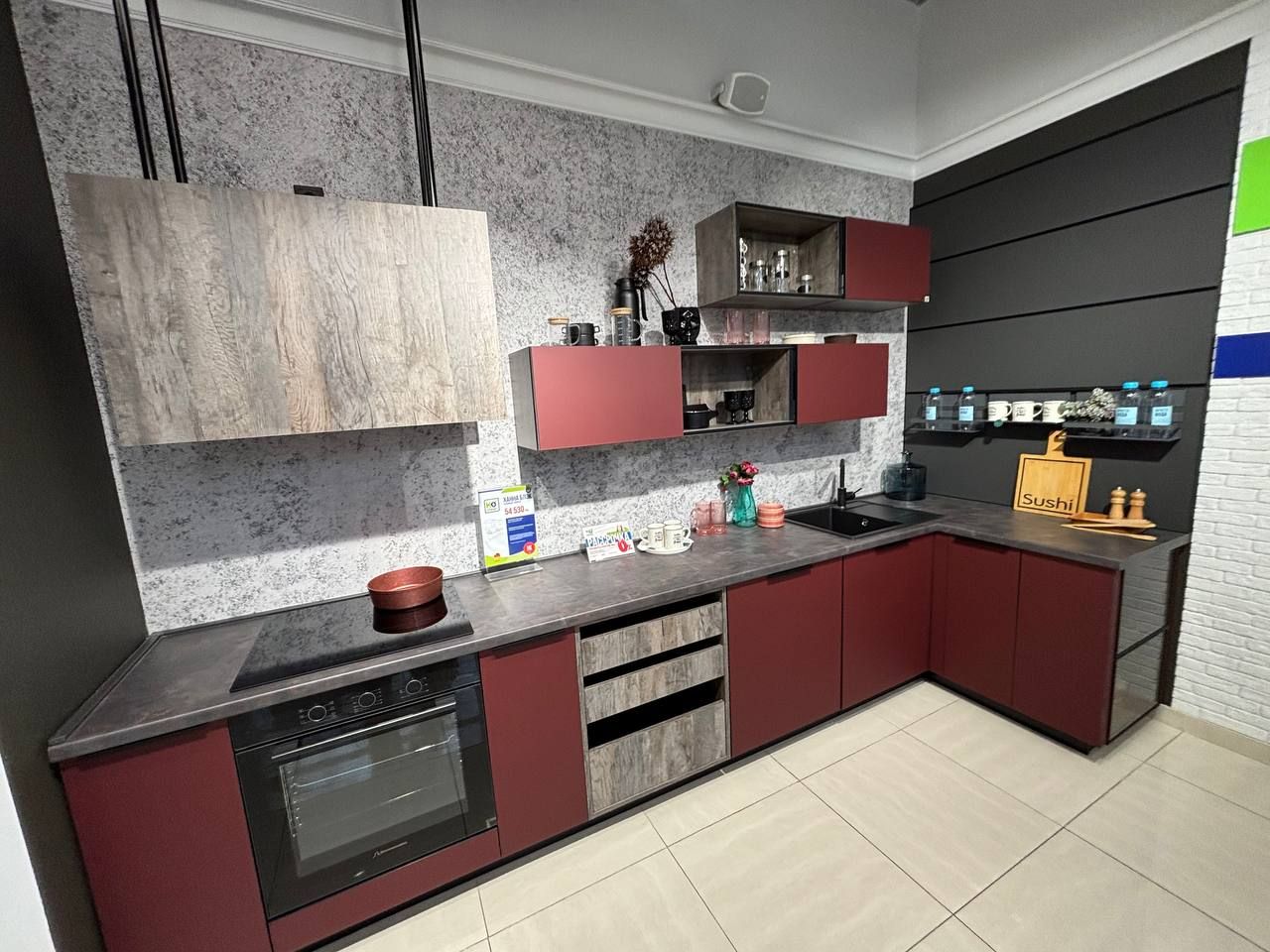 Особенности: Супер матовые фасады с черной кромкой, подвесная вытяжка.