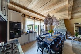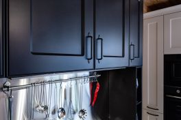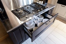 Длинная «белая» зона была оборудована современной бытовой техникой. Здесь за глухими фасадами разместились: большой холодильник, отдельная морозильная камера и посудомоечная машина. Слева в углу на удобной высоте – кофе-машина и вместительный духовой шкаф на 75 литров. А вот варочная панель «прописалась» в «тёмной» зоне. Панель газовая, имеет 5 конфорок и идеально подходит для большого семейства. А чтобы после готовки не пришлось долго убираться, фартук и столешницу здесь решено было сделать из нержавеющей стали. Получился настоящий большой «очаг», где создают изысканные кулинарные шедевры! Стоит ли говорить, об органайзерах, выкатных системах, автодоводчиках и системах полного выдвижения ящиков? Новый гарнитур семьи Тихоновых оснащен превосходно! И знаете – именно такая кухня должна быть в доме, где живет счастье!